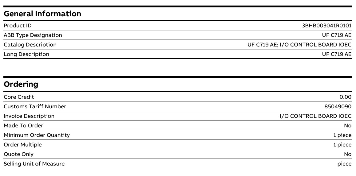 ABB 3BHB003041R0101 UFC719AE — это специальная плата управления вводом/выводом, разработанная и изготовленная компанией ABB для систем промышленной автоматизации и приводов. Согласно предоставленной таблице данных, эта плата не является независимым модульным устройством ввода-вывода, которое можно использовать непосредственно на месте, а интегрируется в качестве основного функционального компонента в более сложный комплект. Основная функция заключается в управлении, обработке и координации цифровых или аналоговых сигналов ввода-вывода в этих комплектах, служа мостом, соединяющим главный контроллер с внешними полевыми устройствами. Эта плата управления вводом-выводом отражает стремление компании ABB в области силовой электроники и промышленного управления к высокой надежности, компактному дизайну и системной интеграции с целью обеспечить стабильную и эффективную базовую поддержку ввода-вывода для решений ABB по приводам и автоматизации.