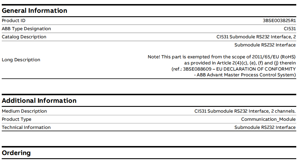 CI531 — это специальный компонент расширения последовательной связи в распределенной системе управления процессами ABB Advant Master. 3BSE003825R1 определяется как субмодуль интерфейса RS232, 2 канала. Основная функция заключается в обеспечении двух независимых асинхронных последовательных портов связи, соответствующих стандарту EIA-232, для контроллеров серии Advant Controller 410/450.