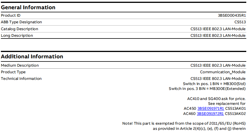 CS513 является ключевым компонентом сетевой связи в распределенной системе управления процессами ABB Advant Master. 3BSE000435R1 определяется как модуль локальной сети IEEE 802.3. Его основная функция — предоставить стандартный интерфейс связи Ethernet для контроллеров серии Advant Controller 410/450, позволяя им получать доступ к локальным сетям заводского уровня на основе протокола IEEE 802.3.
