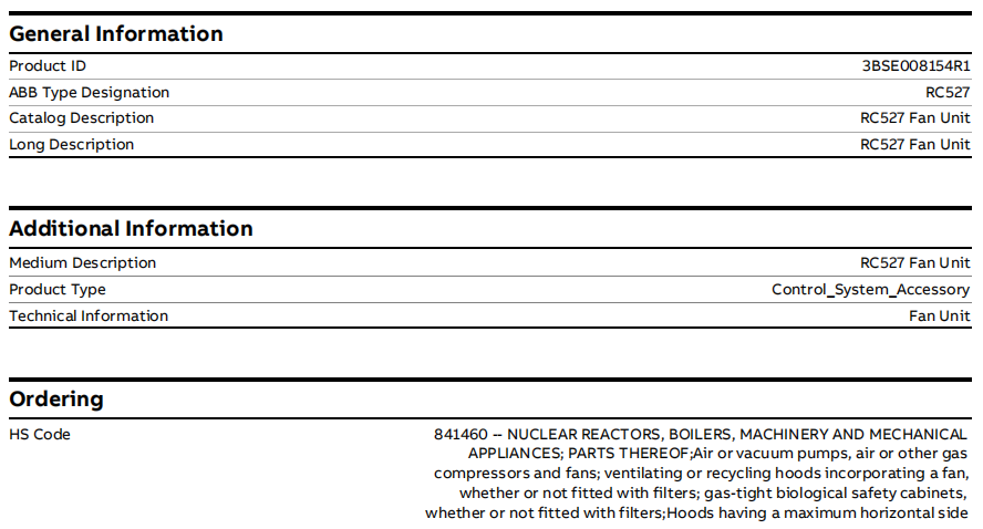 В больших РСУ, таких как Advant Master, которые используются в критических промышленных процессах, стойка контроллера объединяет внутри большое количество плотно расположенных электронных компонентов, выделяющих значительное количество тепла. Если тепло не удастся рассеять вовремя, это приведет к резкому повышению внутренней температуры оборудования. В легких случаях 3BSE008154R1 может привести к нестабильности системы и ошибкам связи; в тяжелых случаях RC527 может вызвать перегрев и повреждение компонентов, что приведет к серьезным производственным авариям. Вентиляторный блок RC527 представляет собой специальное оборудование для решения этой проблемы и является важной частью обеспечения надежности физического уровня системы.