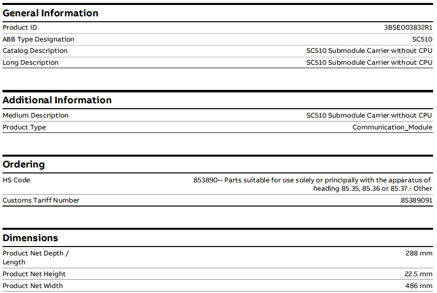ABB SC510 — это ключевая платформа аппаратного расширения в распределенной системе управления процессами Advant Master. 3BSE003832R1 определяется как несущая подмодуля без ЦП. Основная функция — служить носителем физических и электрических интерфейсов для установки и переноса различных функциональных коммуникационных субмодулей.