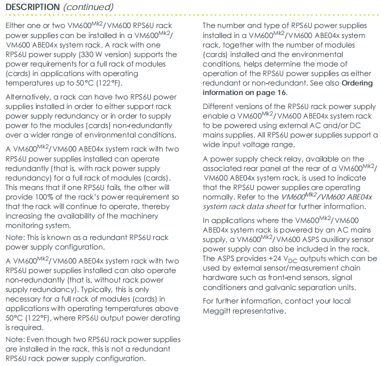 RPS6U — это специальный модуль питания высотой 6U, монтируемый в стойку, разработанный компанией Megite Sensing Systems для платформы системы мониторинга состояния и механической защиты VM600 Mk2 / VM600. RPS6U 200-582-993-NHH отвечает за обеспечение стабильного, надежного и резервного рабочего питания постоянного тока для всех плат обработки, карт ввода-вывода и карт связи во всей стойке VM600. Модель 200-582-993-NHH конкретно относится к «версии источника питания RPS6U с входом постоянного тока», а ее задняя панель имеет особую конфигурацию: Номер заказа (PNR): 200-582-993-NHH